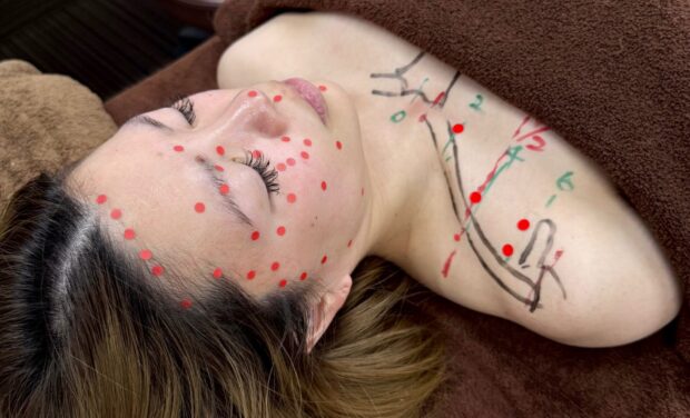 お顔のどのツボをどんな風に狙っていくか、書きながら学んだ後に実践する事で
