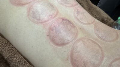 背部の経穴へのカッピング、お顔のツボ刺激とマッサージ、細かな筋繊維を捉えながら行うスライドカッピング。